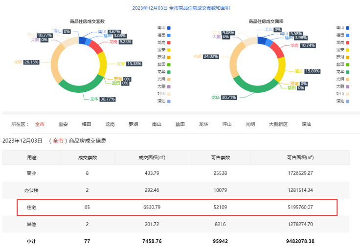12月3日新房住宅共网签65套。宝安10套;福田2套;龙岗6套;罗湖0套;南山3套;盐田0套;龙华20套;坪山7套;光明17套;大鹏0套;深汕0套。