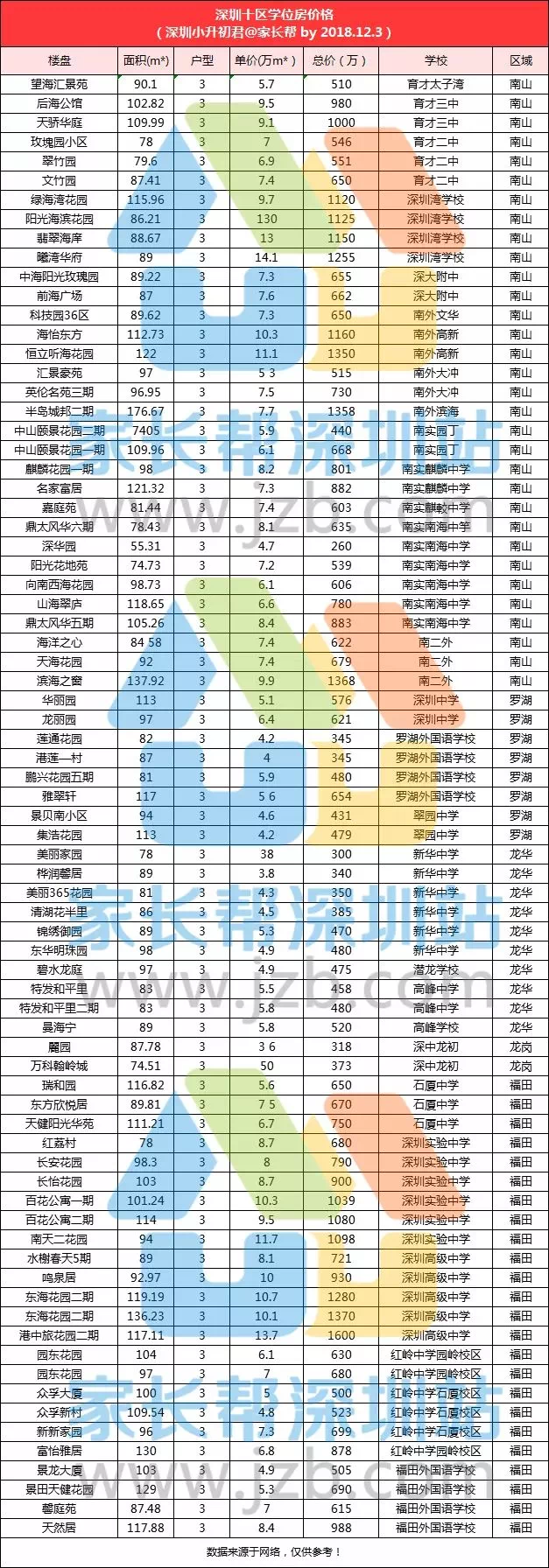 1、小编给大家整理了深圳六区下的11个片区,累计54套学位房的成交价格。包括罗湖(翠竹、红岭)、福田(百花、石厦、侨香)、南山(南头、蛇口)、宝安(新安、西乡)、龙岗(龙岗中心城)、盐田(沙角头)。