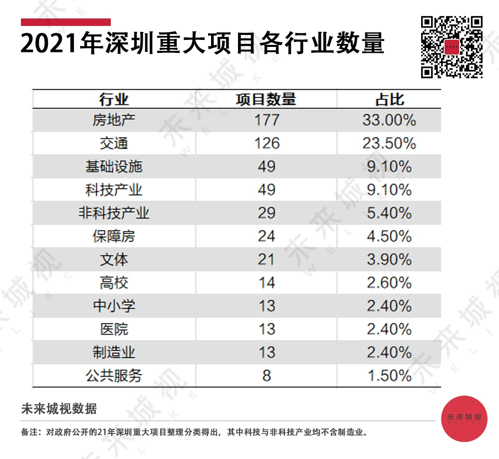 我们发现,房地产依然是深圳重大项目的大头。像前海金融大厦、越海全球中心等商业地产,湖贝城市更新、民治城市更新等旧改项目,为深圳地产现在的主旋律。房地产、交通项目分别有177项、126项,二者之和占比高达56.5%。制造业是实体经济的主体,是城市经济发展的根基和综合实力的体现,2021年名单中制造业共有13项,占比为2.4%。3.深圳狂补文体短板深圳作为后发城市,文体氛围略有欠缺。但其深知文体、教育是提升城市居民素质的重要保障,清单中有多达10%的项目与之相关。这彰显了深圳不仅是一座科技之城,也是一座注重城市人文气息与文化底蕴的城市。新时代十大文化设施中,已有九座开建。