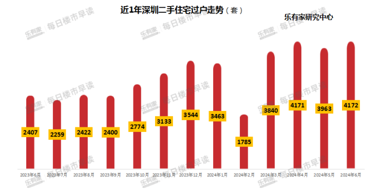 细化到具体月度数据来看,乐有家研究中心监测显示,6月全市二手住宅过户4172套,环比上涨5%,同比上涨73%。6月过户量重回4000大关,近4个月过户量均稳定在4000套左右。