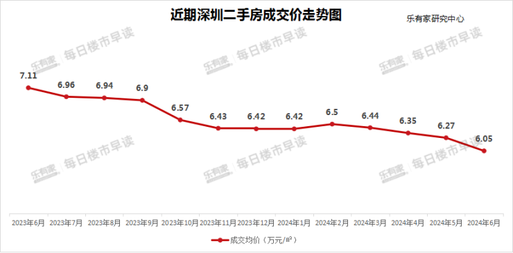 乐有家门店成交数据显示,6月全市二手住宅成交均价为6.05万元/㎡,环比下跌4%,同比下跌15%;最新业主挂牌价6.79万元/㎡,环比下跌1%,同比下跌11%。“以价换量”特征仍十分明显。