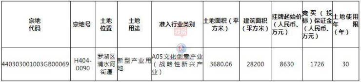 宗地号H404-0090,土地位置罗湖区清水河街道,土地用途新型产业用地,准入行业类别A05文化创意产业(战略性新兴产业),土地面积3680.06平方米,建筑面积28200平方米,挂牌起始价8630万元,土地使用年限30年。