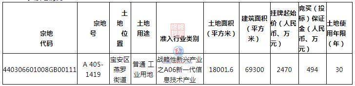 宗地号A405-1419,土地位置宝安区燕罗街道,土地用途普通工业用地,准入行业类别战略性新兴产业之A06新一代信息技术产业,土地面积18001.6平方米,建筑面积69300平方米,挂牌起始价2470万元,土地使用年限30年。