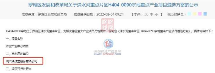 8月4日,罗湖区发展和改革局发布《关于清水河重点片区H404-0090宗地重点产业项目遴选方案的公示》(以下简称方案)。方案显示,意向用地单位为周六福珠宝股份有限公司。