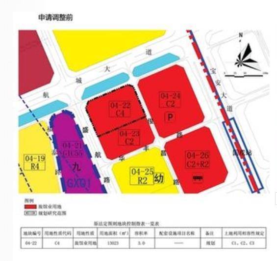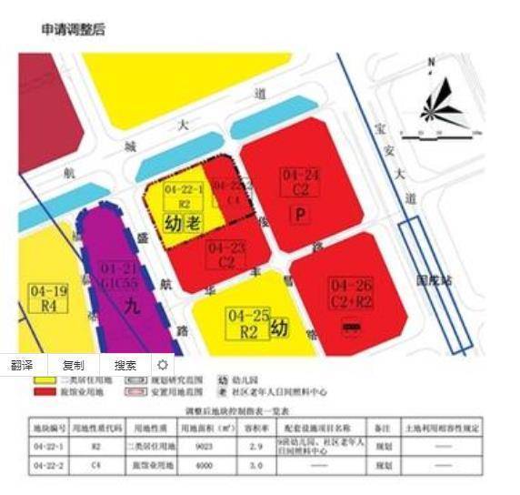 原04-22地块调整为04-22-1、04-22-2两个地块,其中04-22-1为置换用地,地块用地面积9023平方米,用地性质由旅馆业用地调整为二类居住用地(R2), 容积率由3.0调整至2.9,配套设施名称为9班幼儿园、社区老年人日间照料中心,备注规划;04-22-2地块用地面积为4000平方米,其他保持不变。