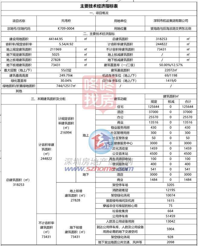 规划显示,元湾府项目建设用地面积44144.95平方米,容积率5.54,建筑最高高速249.79米,最大层数55层。