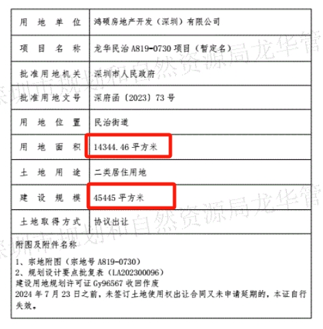根据深圳规自局龙华管理局此前给A819-0730项目下发的建设用地规划许可证,项目用地面积1.43万㎡,建面约4.5万㎡。