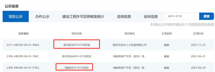 据了解,龙华人才安居于11月23日对这个项目进行立项;在龙华人才安居之前,鸿硕房地产也对该项目进行过立项公示。