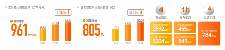 在坚持高质量发展的同时,金地管理2024年新增签约面积同比增速仍达到33%,规模始终保持在行业TOP5领先的增长态势。截至2024年末,金地代建业务实现累计签约管理面积超3830万平方米;住宅项目累计签约货值超3200亿元,同比增速达34%;商办项目累计签约管理投资规模达849亿元,政府代建规模超784万平方米。