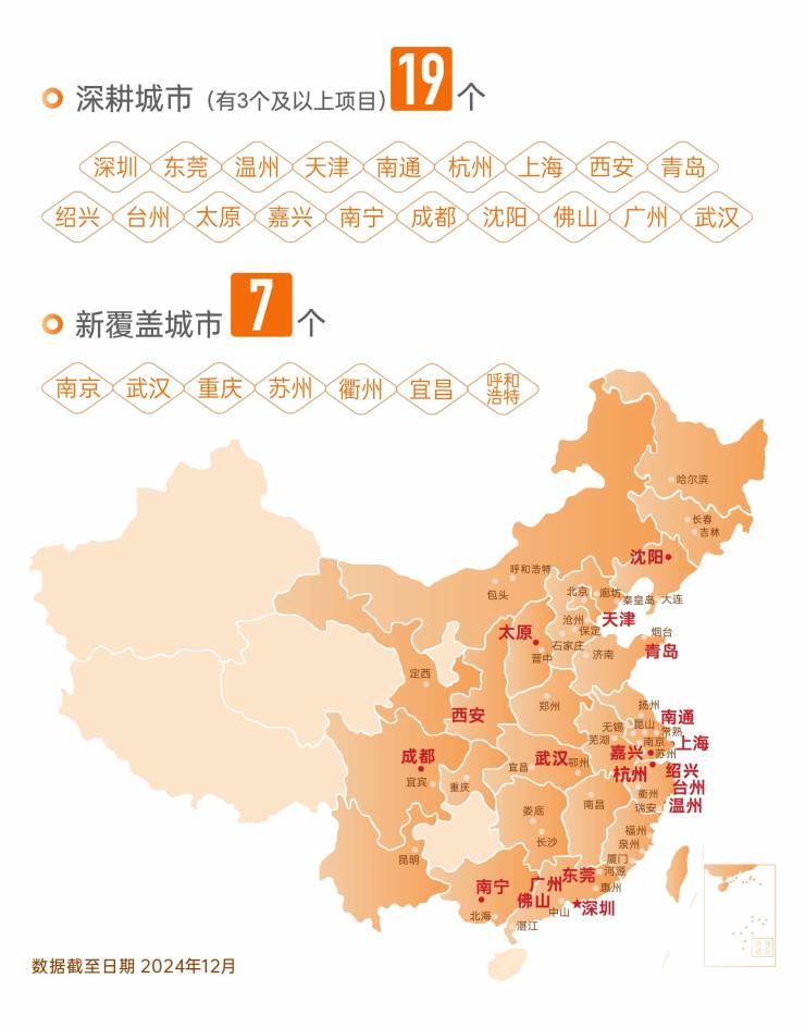 在房地产市场深度调整周期,头部代建企业布局倾向于抗风险能力更强的一二线城市。在规模增长的背后,金地管理始终注重业务的高质量发展,持续深耕一二线高能级城市,盈利能力和抗风险能力持续提升。2024年,金地管理深耕城市(含3个以上项目)达19个,覆盖深圳、天津等核心城市群,并且不断优化客户结构,保持高质量水平,国企城投、村集体与政府代建占比超72%,业务发展更加稳健。