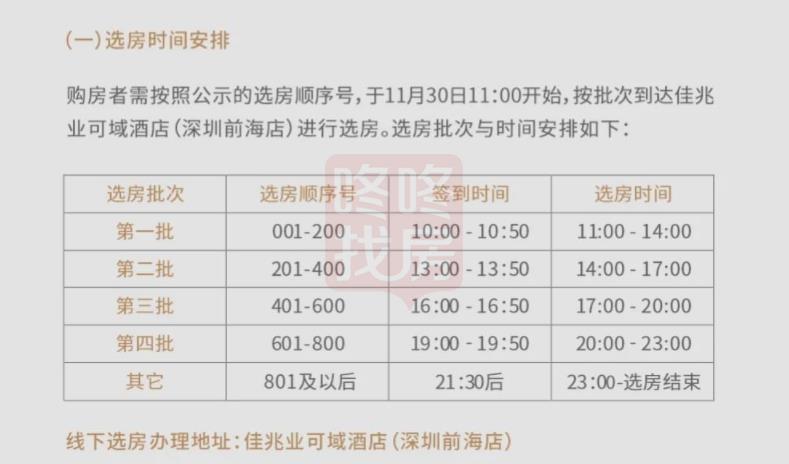 本次【选房规则】为前海公证处全程监督、录像;主持人叫号,每5位购房者为一组,按照选房顺序依次进入销控区,每位购房者选房时间不得超过1分钟,过时未选视为自动放弃选房资格;