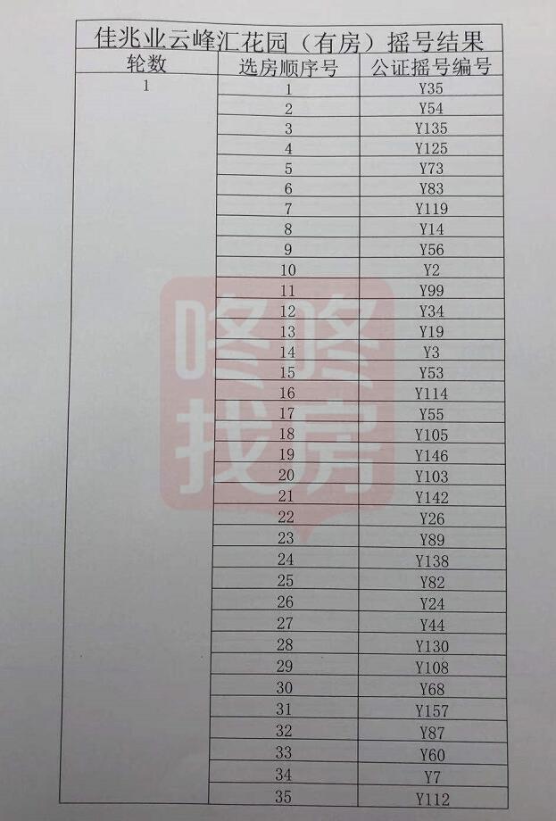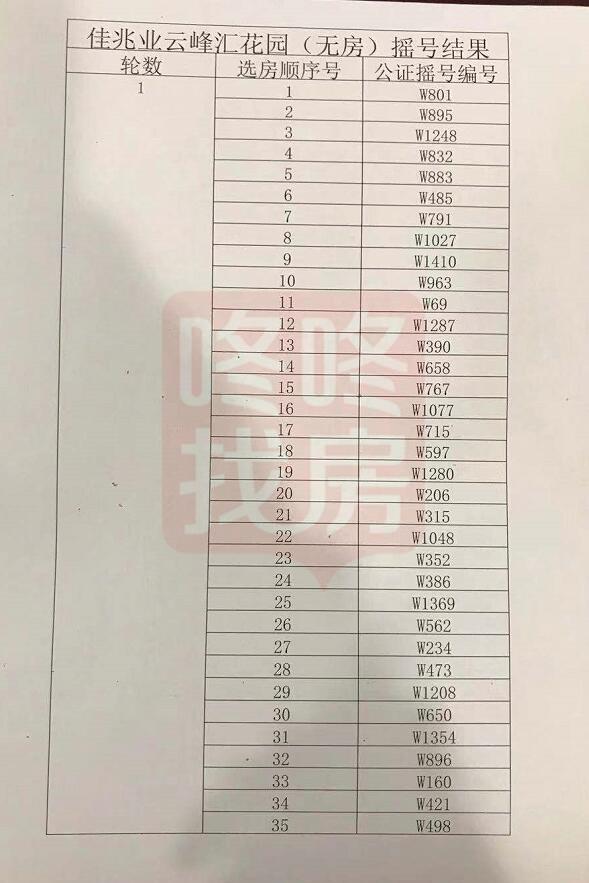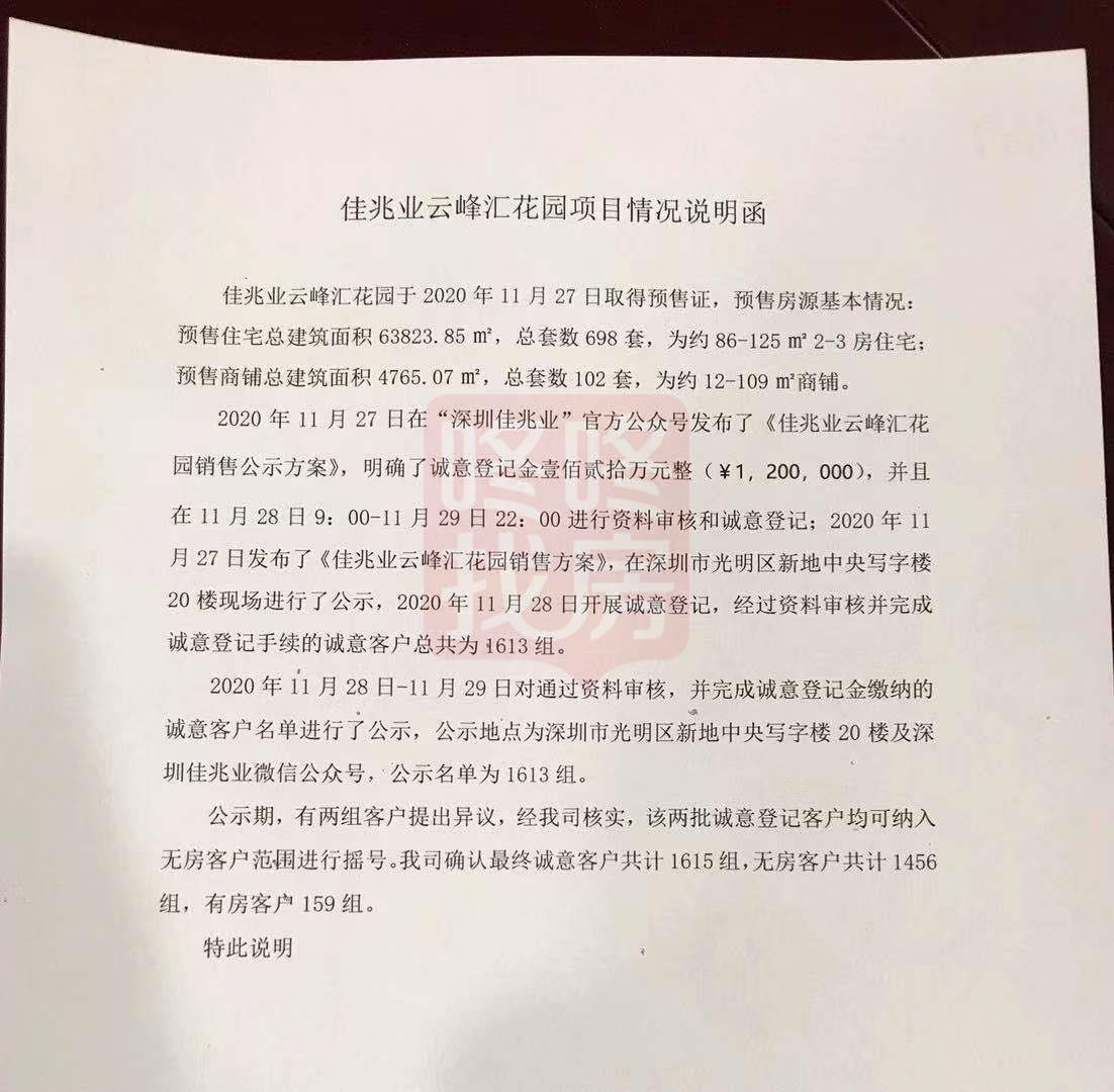 深圳市保润房地产开发有限公司依据销售方案在佳兆业云峰汇花园项目认筹现场,对通过审核的“认筹登记人名册”予以现场公示,公示无异议后,深圳市保润房地产开发有限公司确认有效 “公证摇号编号”共计1615个,其中无房客1456个,有房客户159个。