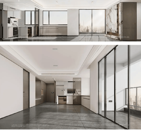 建面约91㎡户型则形成超大尺度的餐厅空间,可根据日常生活分隔开来灵活使用,相当于多了一个房间,形成2+2空间的结构。