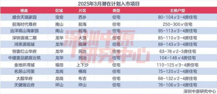 库存压力减轻加之3月“小阳春”势头明显,开发商推盘意愿也更为强烈,据深圳中原研究中心统计,3月预计有11个新盘项目计划入市,包括位于前海、龙华等多个热盘在内。