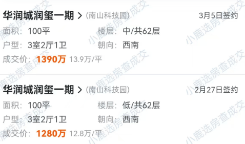 以华润城润玺一期为例,据@小鹿选房 平台成交数据,小区2月底到3月初各成交一套建面约100㎡的房源,最新成交价较2月27日成交价高出110万。将近一周的时间,价格就相差了100万+,幅度惊人。