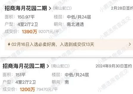 后海的海月花园二期,2月成交的一套151㎡4房,成交价1390万,而同样中低楼层,2024年9月成交价仅1200万,半年左右涨了190万。