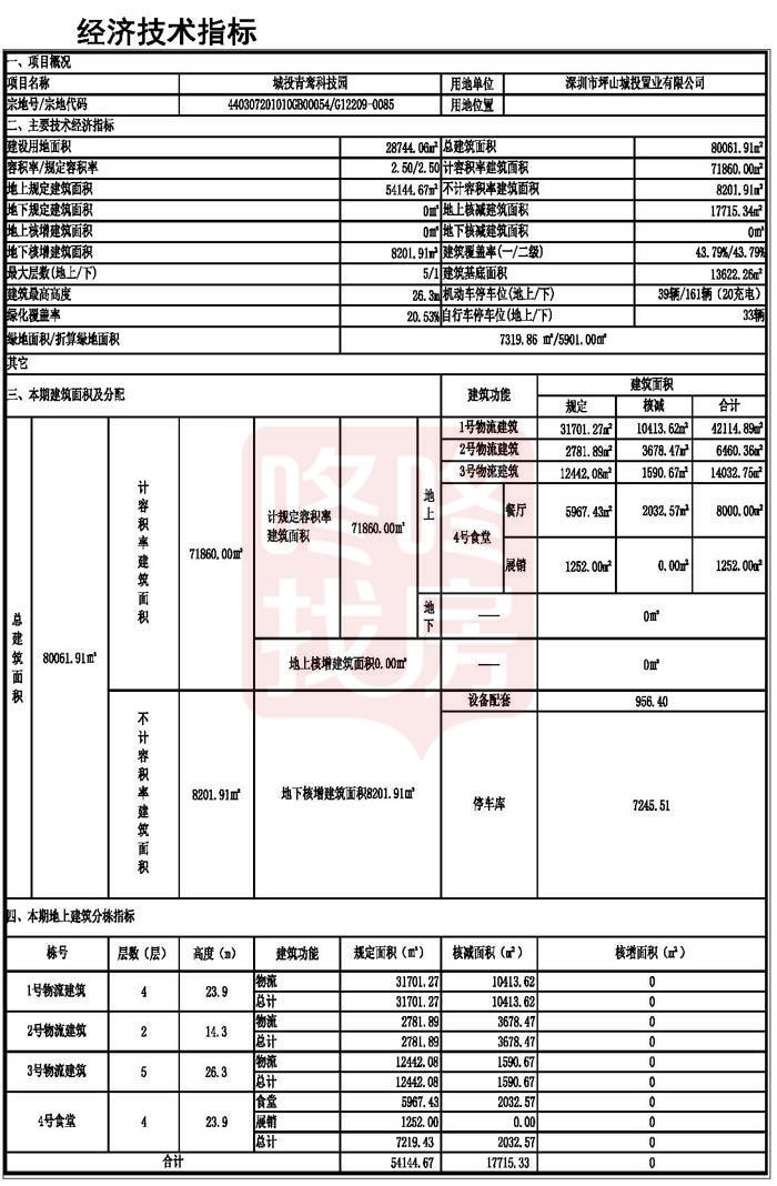 建面80061.91㎡,其中,计容积率建面71860㎡,1号物流建筑31701.27㎡,2号物流建筑2781.89㎡,3号物流建筑12442.67㎡,4号食堂(餐厅5976.43㎡,展销1252㎡);