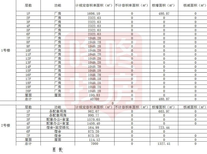 总建面67594.24㎡,其中,计容积率建面49508.28㎡(厂房40700㎡,配套宿舍2000㎡,配套食堂1200㎡,配套办公2200㎡,配套商业800㎡,配套管理用房800㎡),架空绿化1327.41㎡,架空停车场480.87㎡;