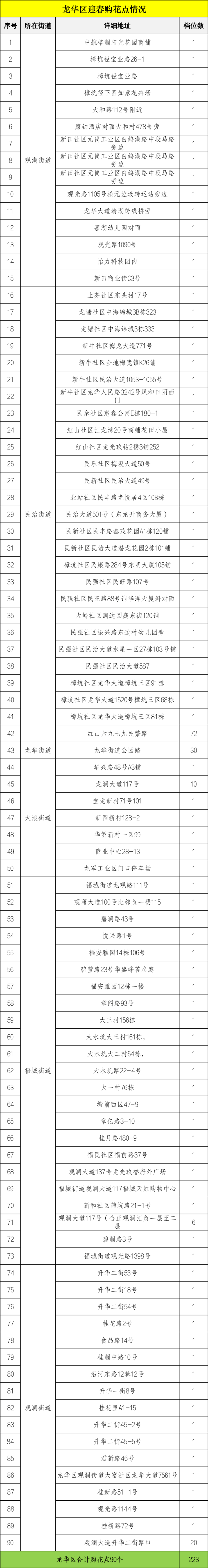 此外,为便于市民就近进行采购,增添年味气氛,各街道还设置有分散的购花点。全区购花点共90个,共有223个档位。