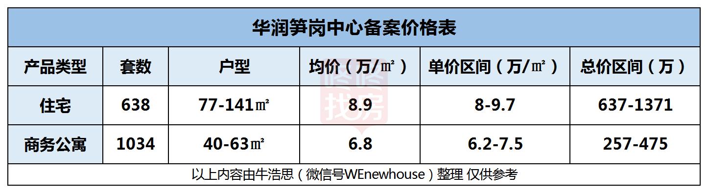 华润笋岗中心获批预售许可证,并在市监局官网公示,本次备案住宅638套,位于A、B座;商务公寓1034套,位于C座。