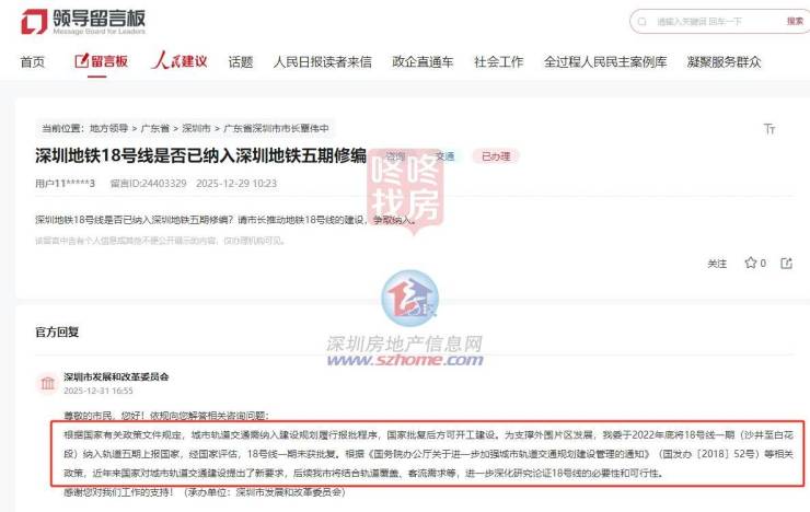 近日,有市民咨询深圳地铁18号线是否已纳入深圳地铁五期修编,并呼吁推动该线路建设。