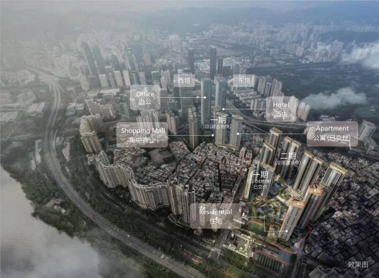 为规划总体量约126万㎡的超级综合体,包含约300米的地标双子塔、购物中心、购物街区、文化广场、高端酒店、精品公寓、海景住宅等多元业态于一体。项目自带约16万㎡商业C Future City,包含一期约8万㎡大型商业MALL,二期约8万㎡创意商业街区。并与现有的KK ONE、Bo Space、万科滨海云空间等商业体,联合营造超50万㎡城市级商圈。