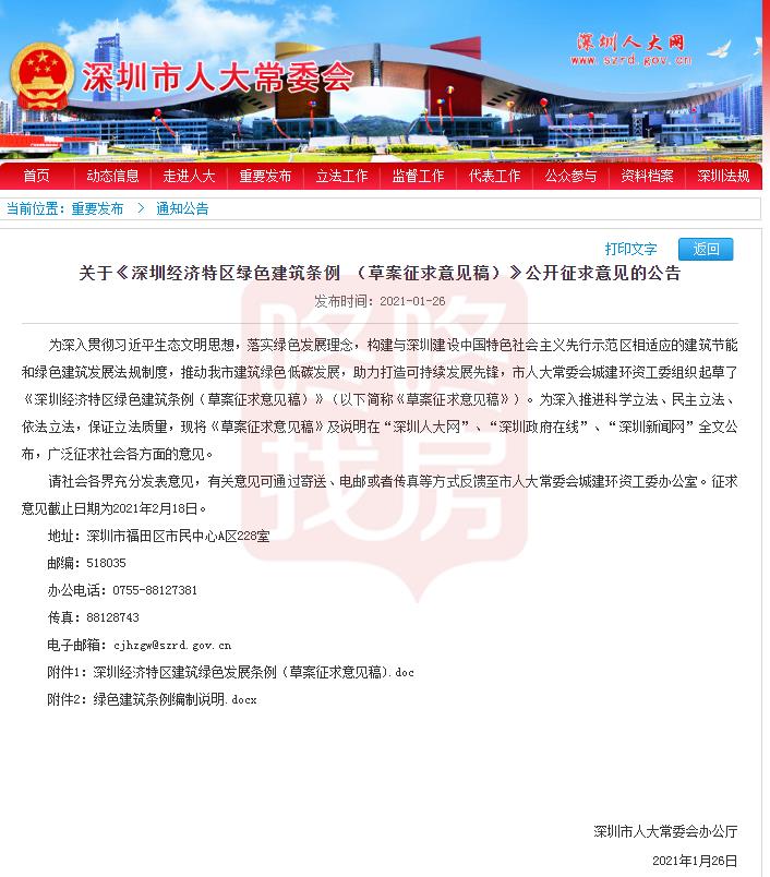 关于《深圳经济特区绿色建筑条例 (草案征求意见稿)》公开征求意见的公告