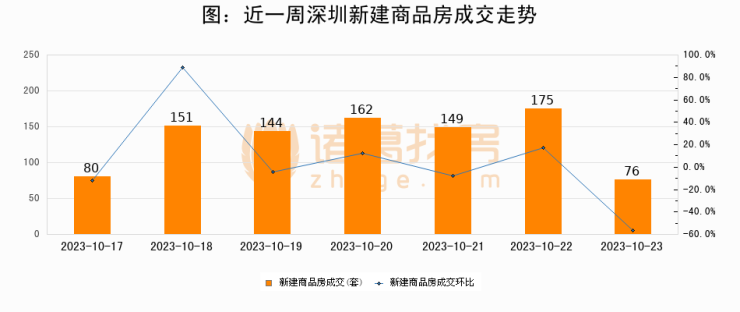 根据深圳市住房和城乡建设局数据显示,2023年10月23日深圳新建商品房成交76套,较昨日减少99套,环比下降56.6%