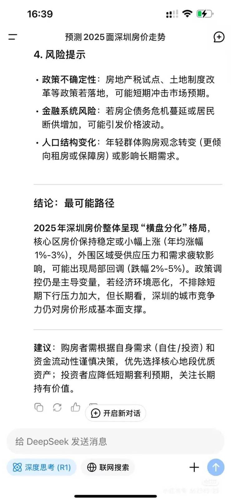 在社交平台上,不少网友向DeepSeek提问2025年深圳房价的涨跌情况。