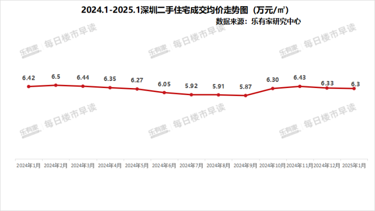 据乐有家研究中心统计,2024年10月-2025年1月,深圳二手住宅成交均价连续4个月稳居6.3万元/平米以上。