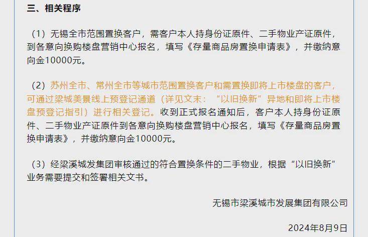 对于无锡全市范围置换客户,需客户本人持身份证原件、二手物业产证原件,到各意向换购楼盘营销中心报名,填写《存量商品房置换申请表》,并缴纳意向金10000元。