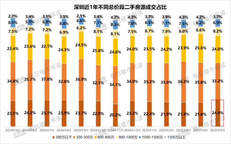 据统计,5月深圳300万以下的刚需住宅成交占比达24%,环比增长2.4%;总价约800-1000万的改善性房源成交占比有所提升,但占比基数较小,仅有8.2%。