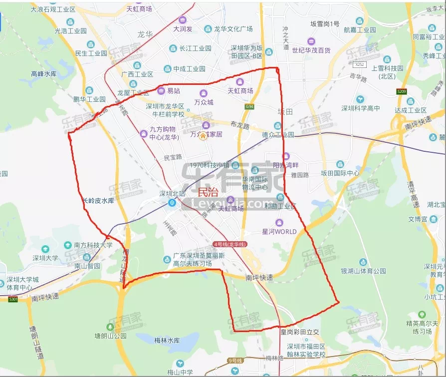 龙华民治片区为福田CBD的后花园,现在逐步发展成为深圳的核心交通枢纽。民治片区位于深圳市龙华区南部,与南山、福田、罗湖、龙岗五区交汇处,从和平路以南,梅林关口以北,新区大道东,工业路和梅观高速以西,辖区总面积30.69平方公里,其中建成区面积13.75平方公里,二线拓展区面积16.94平方公里。