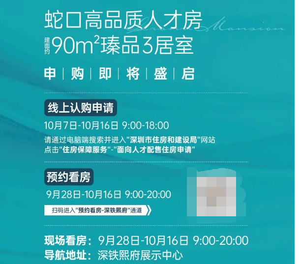 9月27日,深圳住建局发布南山深铁熙府人才房的配售公告,本批配售817套建筑面积约90㎡3房,配售均价为59394.52元/平方米(带装修),线上申请认购时间为2023年10月7日09:00至2023年10月16日18:00。