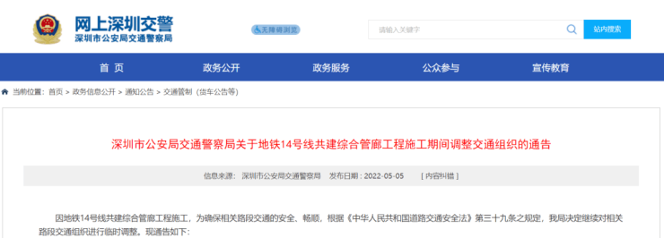 因地铁14号线共建综合管廊工程施工,为确保相关路段交通的安全、畅顺,根据《中华人民共和国道路交通安全法》第三十九条之规定,深圳市公安局交通警察局决定继续对相关路段交通组织进行临时调整。