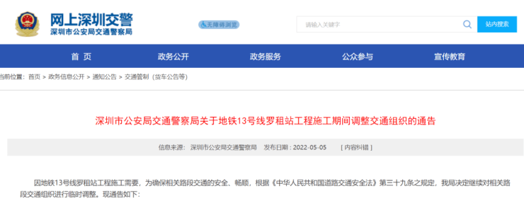 因地铁13号线罗租站工程施工需要,为确保相关路段交通的安全、畅顺,根据《中华人民共和国道路交通安全法》第三十九条之规定,深圳市公安局交通警察局决定继续对相关路段交通组织进行临时调整。