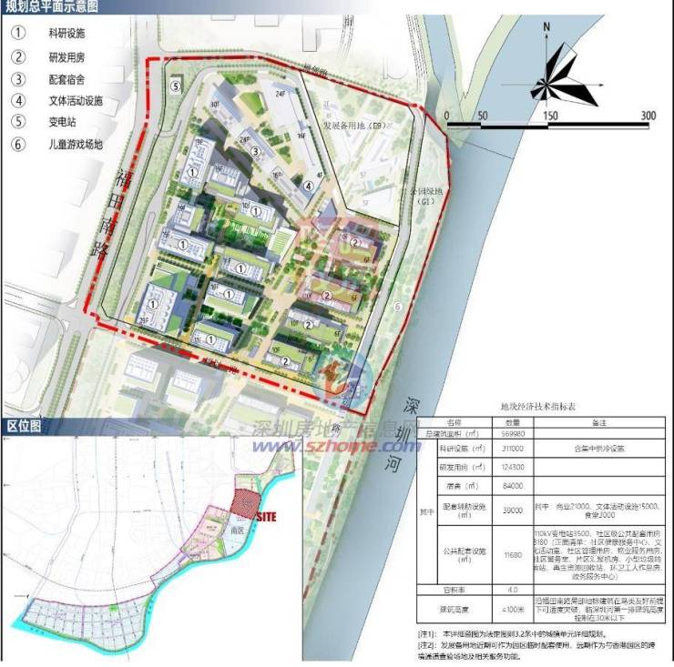 (二)科研用地+新型产业用地(GIC0+M0)规划总建筑面积为569980平方米(包括科研设施311000平方米、研发用房124300平方米、宿舍84000平方米、配套辅助设施39000平方米、公共配套设施11680平方米,具体详见地块经济技术指标表),容积率为4.0,建筑高度≤100米(沿福田南路局部地标建筑在鸟类友好前提下可适度突破,临深圳河第一排建筑高度控制在30米以下)。