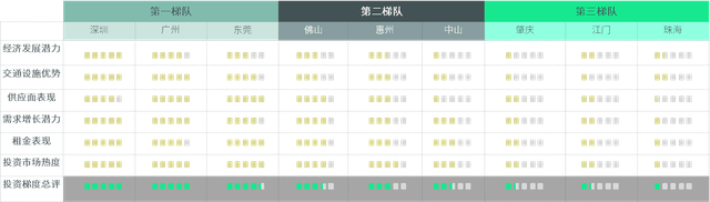 CBRE世邦魏理仕聚焦粤港澳大湾区内地九市,通过对影响物流设施投资的六大相关要素(经济发展潜力、交通设施优势、物流设施供应、需求、租金表现和投资市场热度)进行定量和定性的分析,并基于此对每个城市的不同因素进行星级评价,进而综合得出其投资性的整体评级,最终为投资者描绘出在粤港澳大湾区内地九市进行物流设施投资的三个梯队以及每个城市具体的投资区域、投资标的和投资类型策略。以下为报告内容简要: