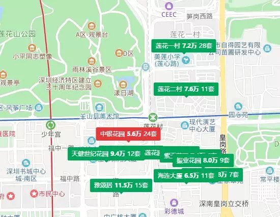 其实这个地方优点很多,最重要的就是地处深圳CBD核心地带,但价格却不高!另外风景好,附近有莲花山公园、笔架山公园、中心公园等,周边商业配套也很完善,有华润万家等大型超市。交通出行便利,靠近少年宫和莲花村两个地铁站。天健小学和黄埔中学都在该小区学区范围内。就是因为颜色和相关传闻,导致很多人谈到这个小区都望而却步,房价也一直涨不起。