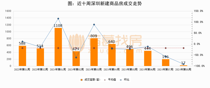 进入2024年第07周(02月12日-02月18日),深圳新建商品房成交17套,较上周减少179套,环比下降91.3%