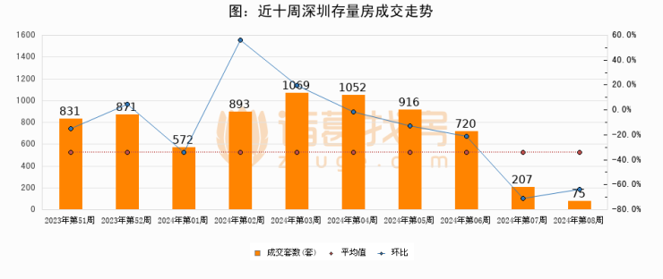 存量房方面,第07周深圳存量房成交75套,较上周减少132套,环比下降63.8%。从近十周成交走势来看,周均成交套数为720套,本周低于平均水平89.6%。