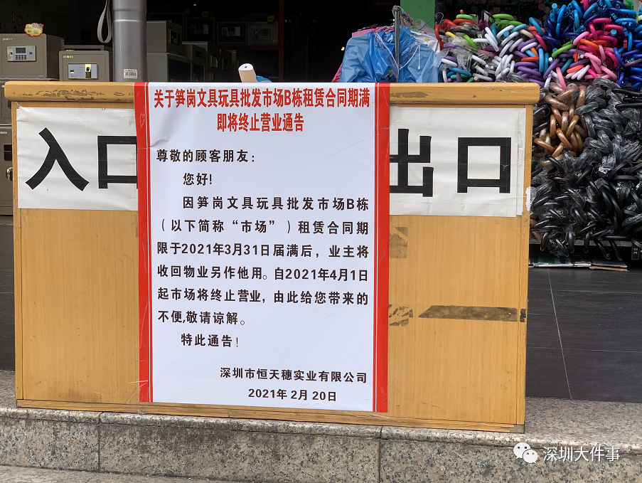 据告示显示,笋岗文具玩具礼品批发市场“自2021年4月1日起市场将终止营业”,是深圳较大型的文具玩具礼品批发市场。