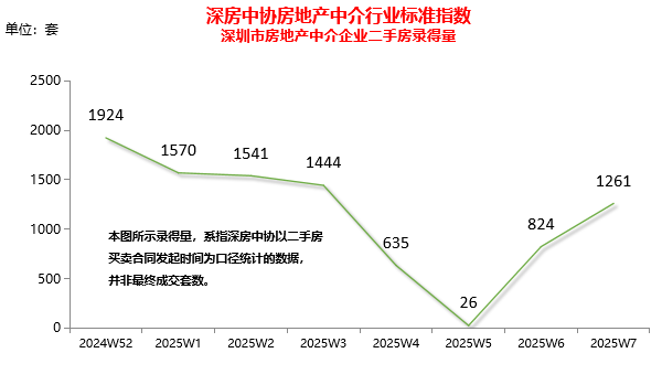 经深房中协统计,2025年第7周全市二手房(含自助)录得1,261套,环比增长53.0%。随着行业从业人员的陆续复工,近期二手房录得量稳步上升中,本周二手房录得量已超千套,基本已恢复到节前水平,市场短期内会呈现一定波动运行走势。