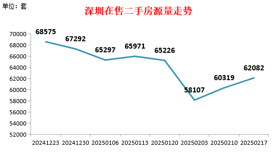根据公开在售二手房源量数据统计,截至2025年2月17日,全市共有62,082套有效二手房源在售,较上周增加1,763套。其中龙岗较上周增加422套,有效在售16,346套,宝安较上周增加299套,有效在售10,990套,南山较上周增加293套,有效在售10,808套。
