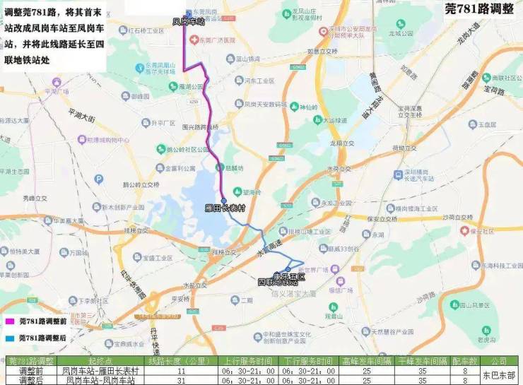 781线(东莞)一端总站由雁田长表村(东莞)调整为四联地铁站(深圳),线路编号变更为莞781(凤岗车站-四联地铁站-凤岗车站,单环线)。