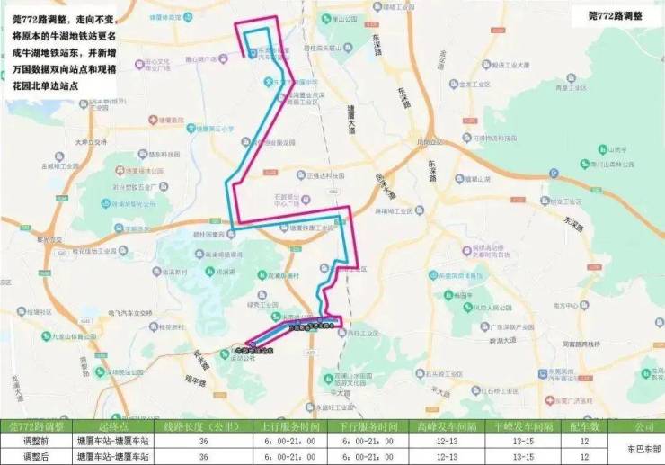 莞772线原“牛湖地铁站”更名为“牛湖地铁站东”;增加“万国数据”1对公交停靠站和“观禧花园北(南侧)”1个单边公交停靠站。
