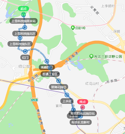 一端总站由秀峰公交总站调整为上雪科技园首末站,另一端总站由笔架山公交总站调整为布吉阳光花园总站,线路调整为布吉阳光花园总站-上雪科技园首末站。