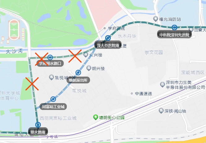 双方向取消“学苑丽水路口”1对公交停靠站,增加“塘朗派出所、同富裕工业城”等2对公交停靠站。
