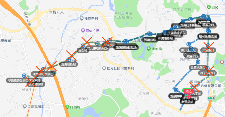 取消“君子布村口、兴发路口、松元公园、松元厦地铁站、岗头村、观澜地铁站、龙华中心医院、长湖地铁站”等8对公交停靠站,和“龙华人才园(东侧)”1个单边公交停靠站。