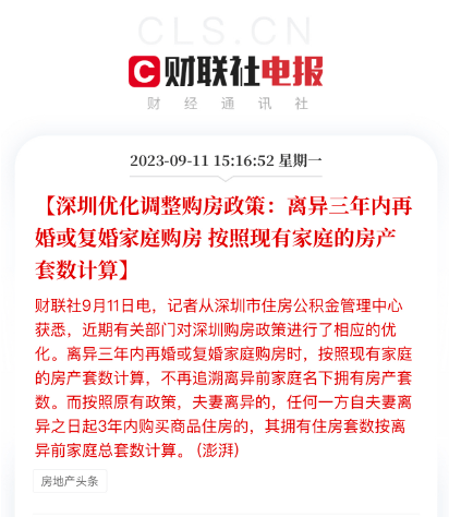 刚刚,多家媒体发文称“近期有关部门对深圳购房政策进行了相应的优化。离异三年内再婚或复婚家庭购房时,按照现有家庭的房产套数计算,不再追溯离异前家庭名下拥有房产套数。”